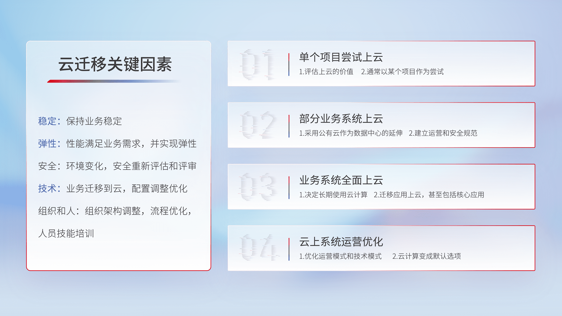 结合实际业务,,从规划设计、、、云平台选型、、、、云原生改造、、、、数据迁移、、集成交付,,,,迁移全过程为客户识别最佳上云路径,,做好风险识别管理,,,设计网络架构、、、身份权限、、安全审计合规、、、操作审计、、日志审计、、、监控告警策略、、多站点容灾设计等,,对云上基础设施进行整体规划,,,,提升IT治理水平,,,以满足弹性、、高可用、、、、高性能的需求。。。。