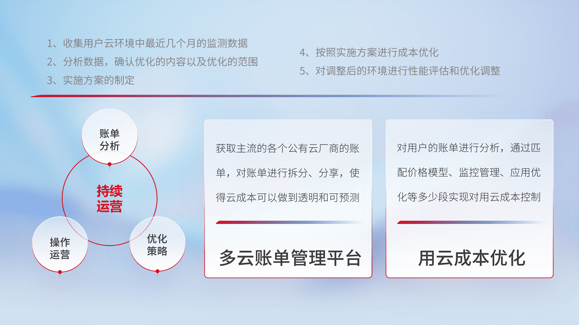 通过多云纳管,,,以统一的资源数据模型把客户的云资源进行抽象和封装,,,进而实现对多云资源的统一操作,,保障云资源管理的可靠性、、、稳定性与可用性。。。量身定制化运维内容,,,,配置、、开发运维、、、补丁管理、、备份、、、、监控、、、、认证和访问管理、、审计和日常巡检等,,,保障在用云过程中的可靠度,,,稳定度以及高可用率。。。